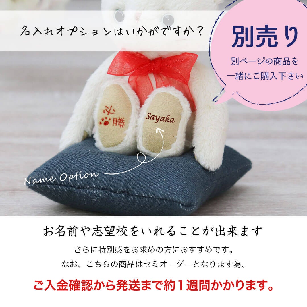 別オプションで足裏にお名前や志望校、メッセージを入れると、世界で一つの必勝祈願ネコになります。
