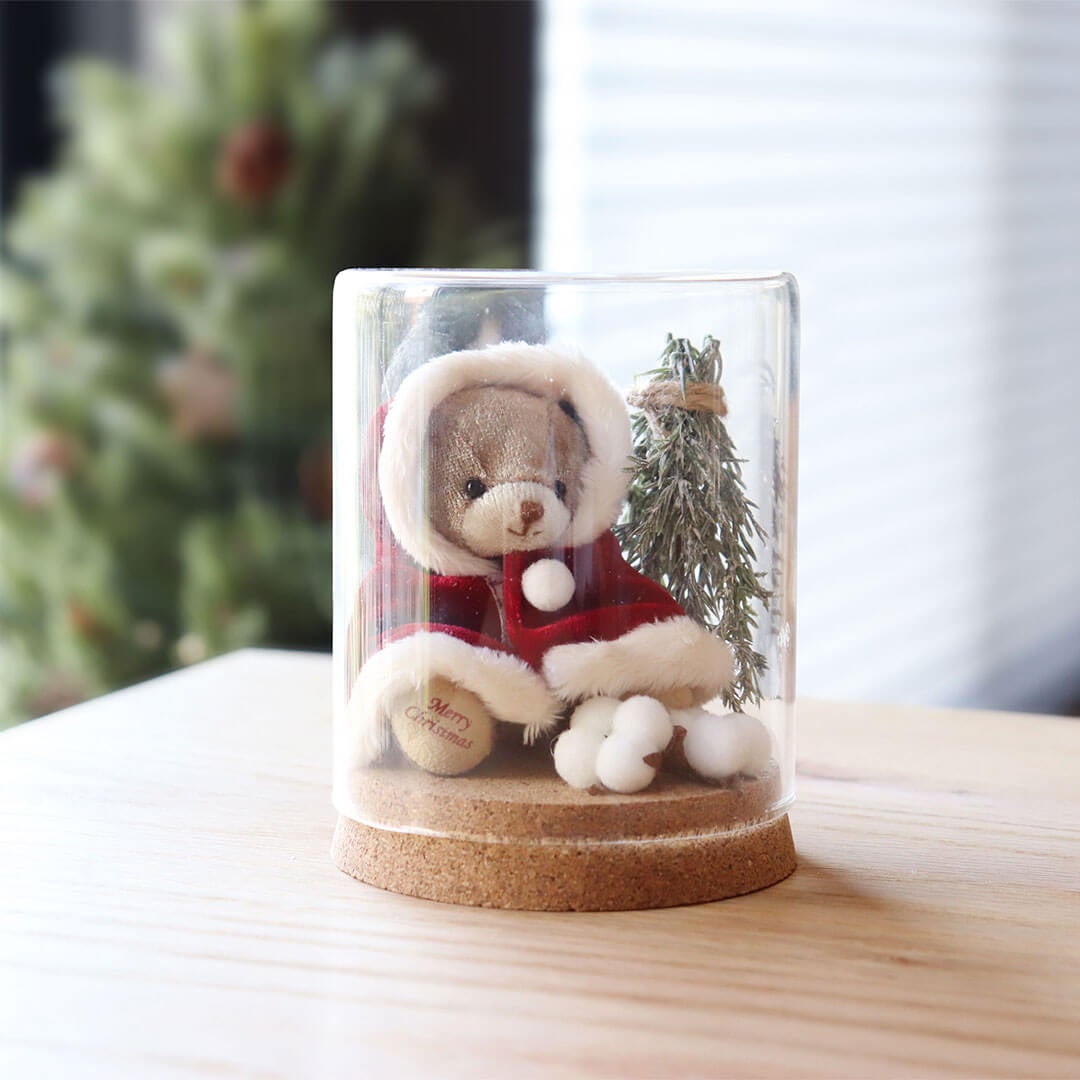 サンタポンチョを着たテディベア: ガラスドームの中には、かわいらしいサンタポンチョを身にまとったテディベアが入っていて、クリスマスの雰囲気を存分に楽しむことができます。