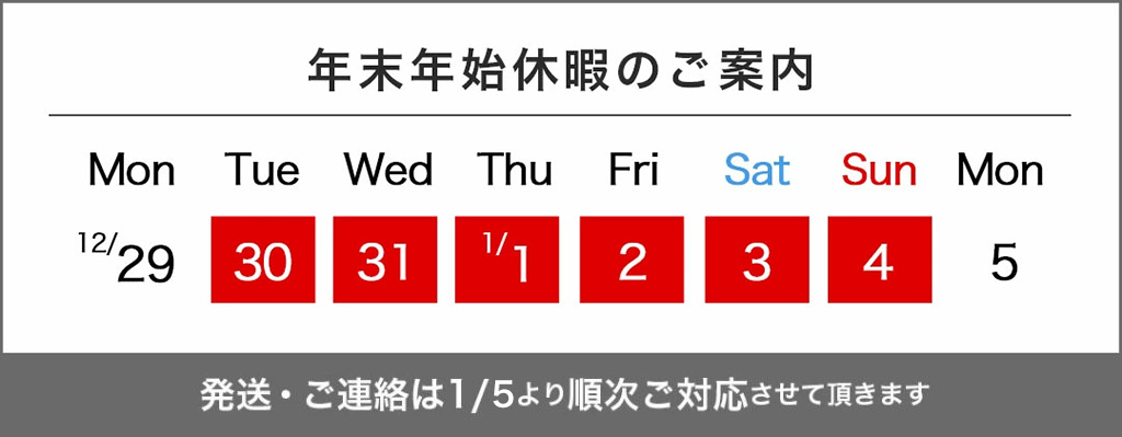 当店は2025年12月30日(火)~2026年1月4日(日)まで、業務をお休みさせていただきます。