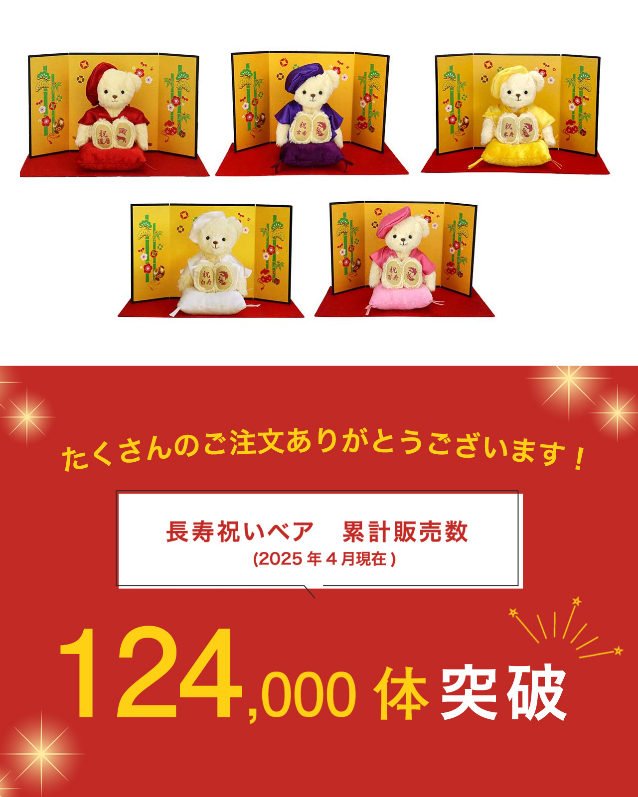 人生で一度きりのお祝い。お祝いの日が終わったあとも部屋に飾ることができ、見るたびにみんなでお祝いをした楽しい思い出が蘇る、長寿ベア。長寿祝いのプレゼントにいかがでしょうか。