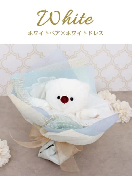 ブーケラッピングをほどくと、豪華で可憐なパーティドレスを 着たあどけない表情のPuk(プック)ベアが登場します。