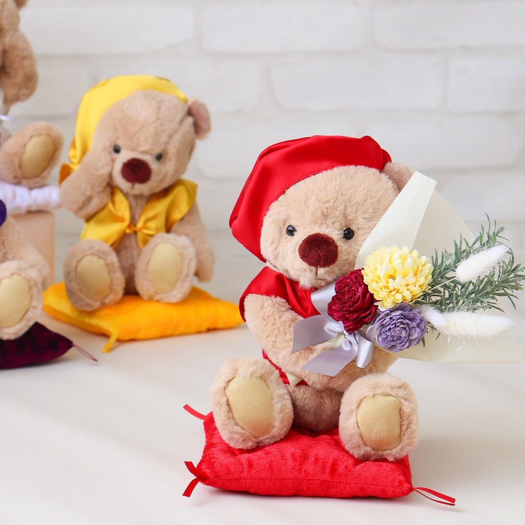還暦・古希・喜寿などの節目を迎えるお父さまに。赤・紫・黄色のちゃんちゃんこを着たベアが、節目のお祝いを華やかに演出します。