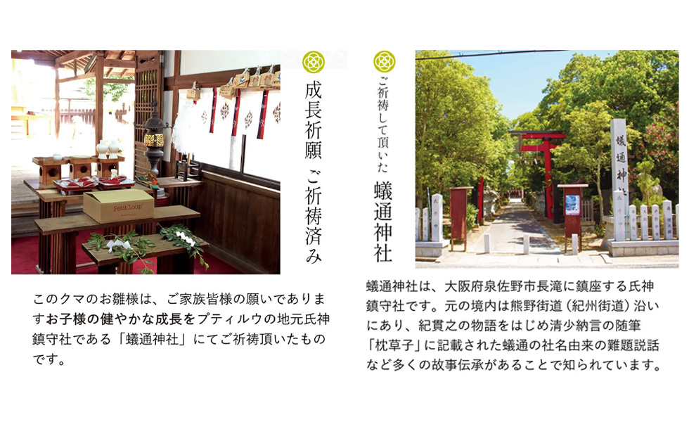 テディベアの形をしていても、お子様の幸せを願う親心は伝統的なお雛様と変わりません。 プティルウでは今年から、皆様の大切なお子様が健やかに成長されることを願い、幸せおひなさまLabとKUU&FUUおひなさま(3S)に、神社での「ご祈祷」を行いました。