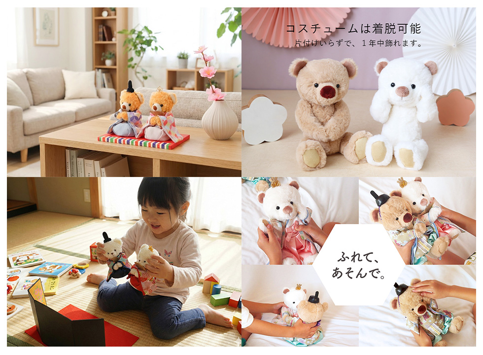 - 現代の住宅事情と「サイズ問題」への回答 多くの家庭で「飾るスペースがない」「収納場所がない」といった住宅事情の悩みが顕在化しています。「くまのおひなさま」は、玄関やリビングの棚にも飾れるコンパクト設計。マンションやアパートでも場所を取らず、現代の子育て世帯が抱える「サイズ」の課題を解決します。