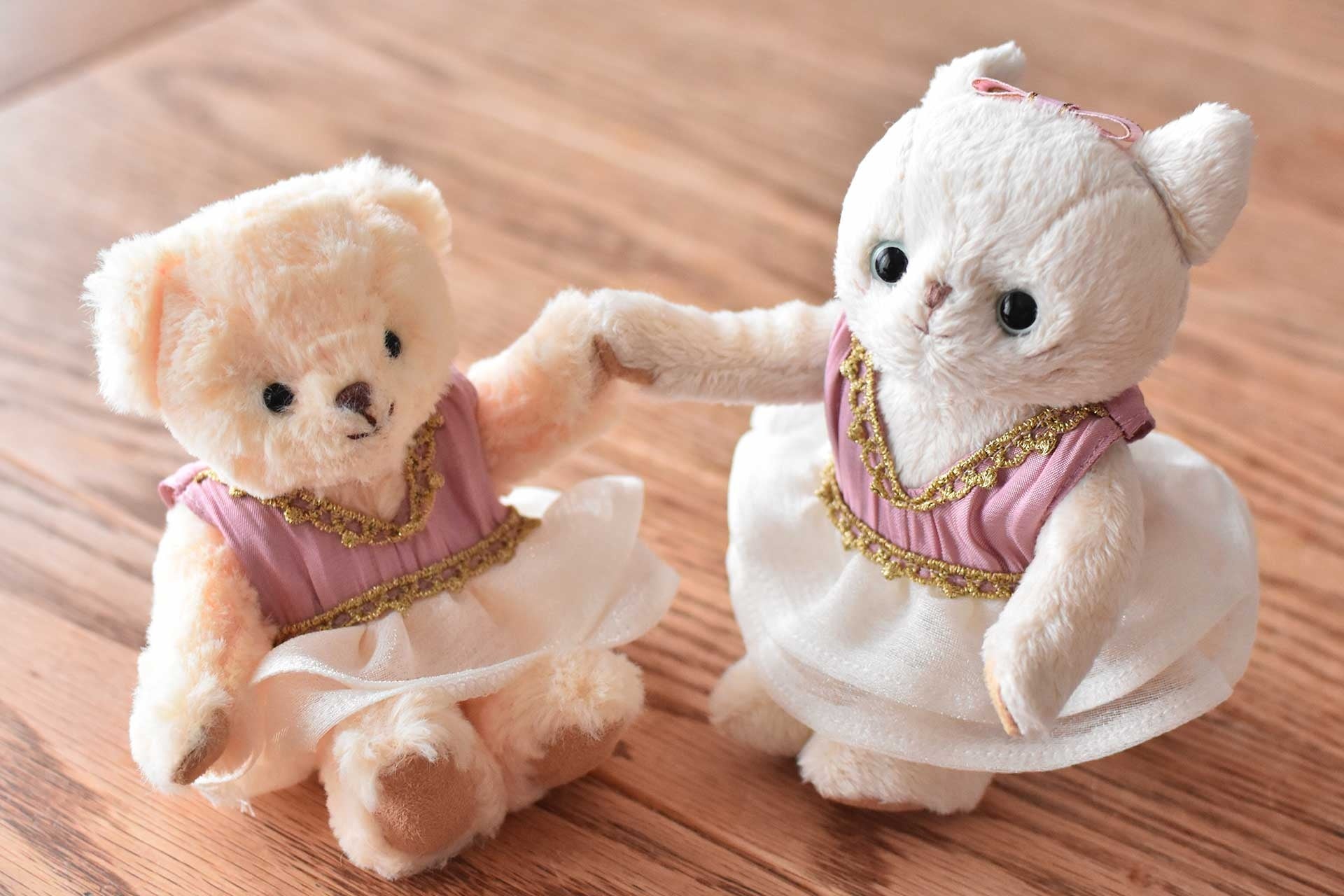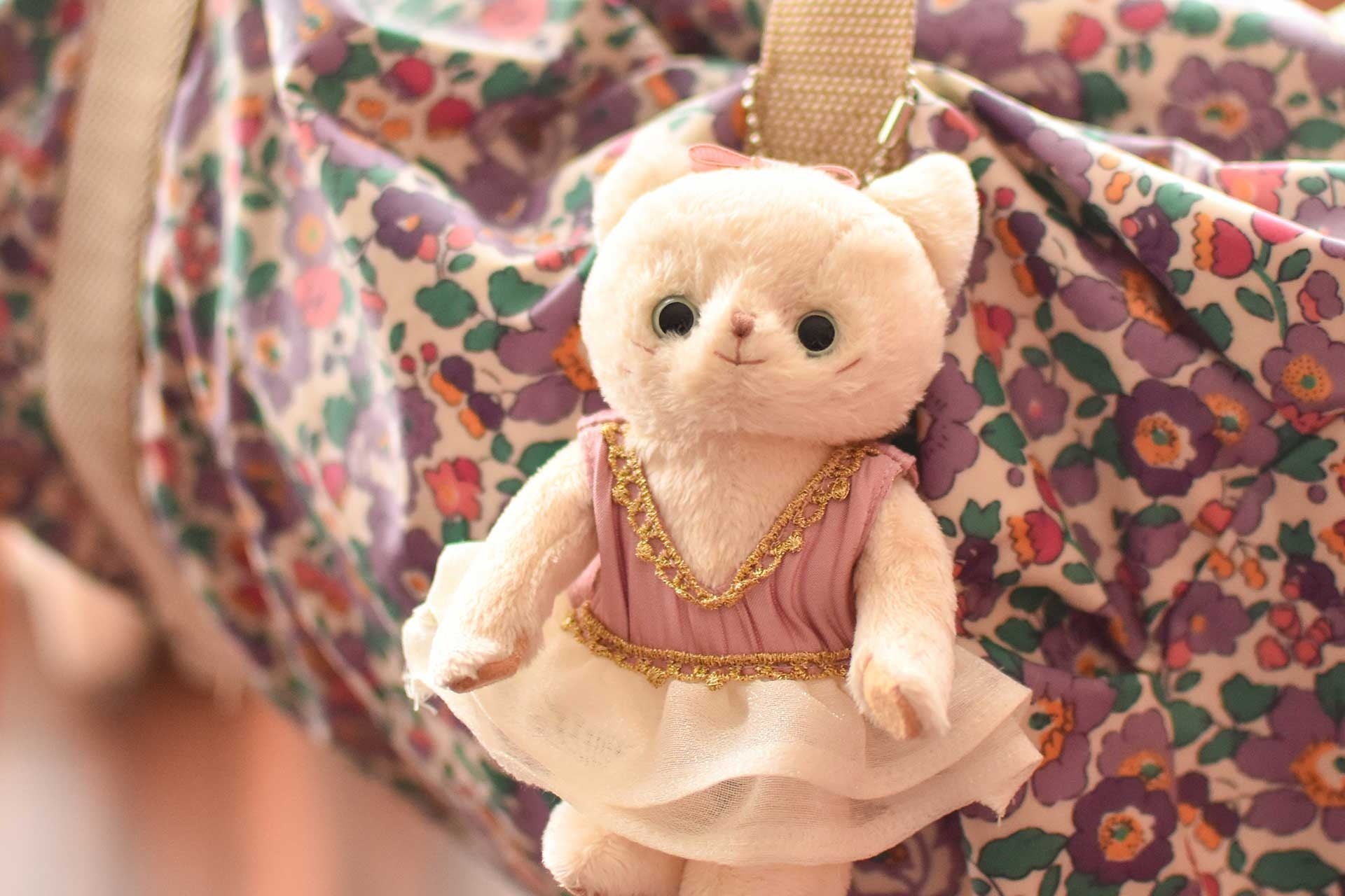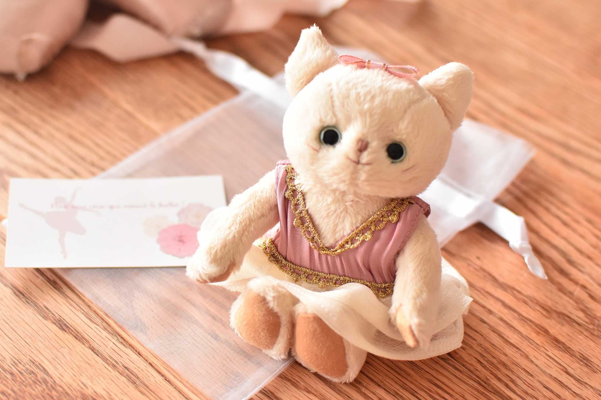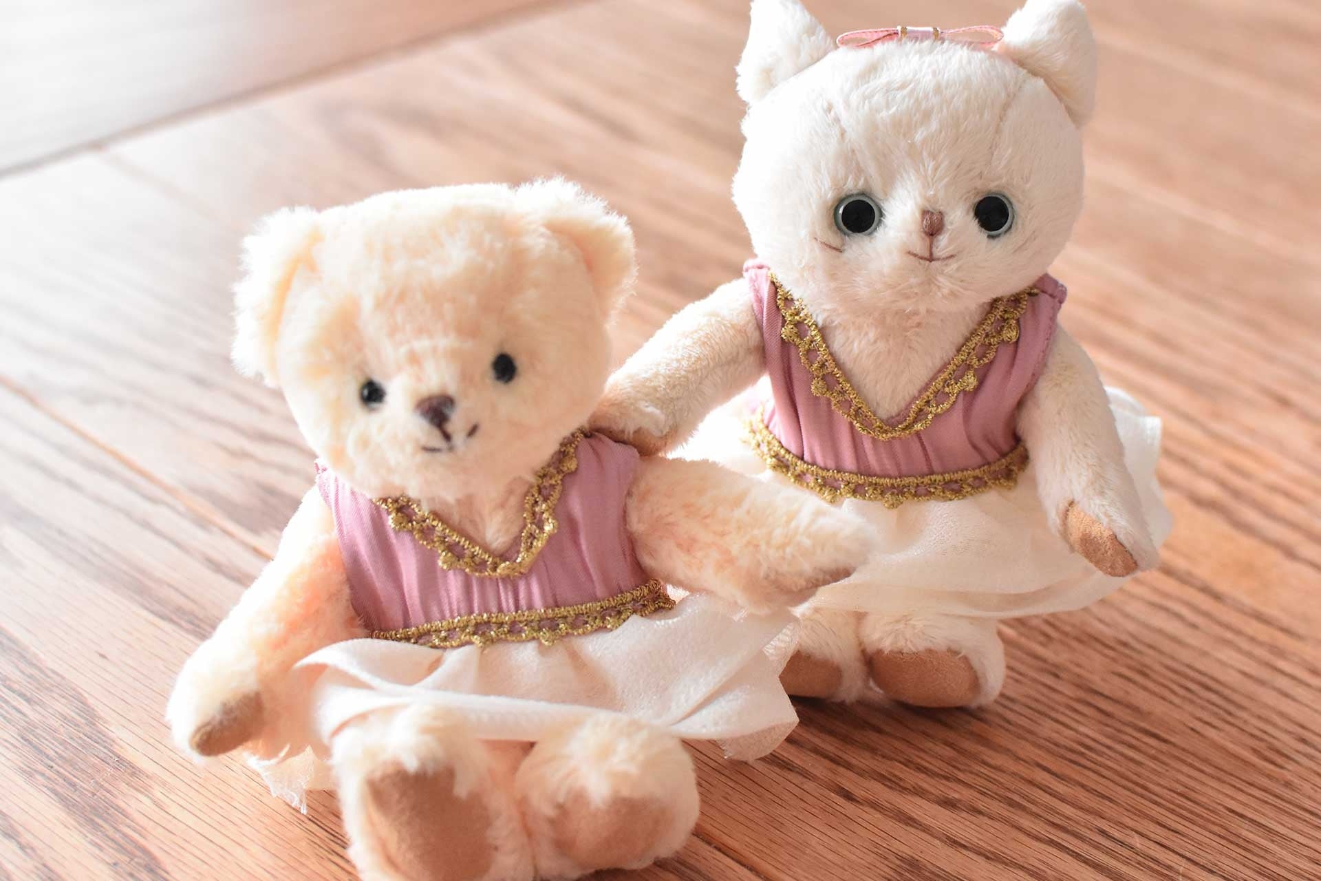 バレエを習う子供たちに馴染みの深いステップ「パ・ドゥ・シャ」という「猫のステップ」。「上手になりますように」という願いを込めて、テディベアだけでなく、ネコのマスコットも選べるようにしました。