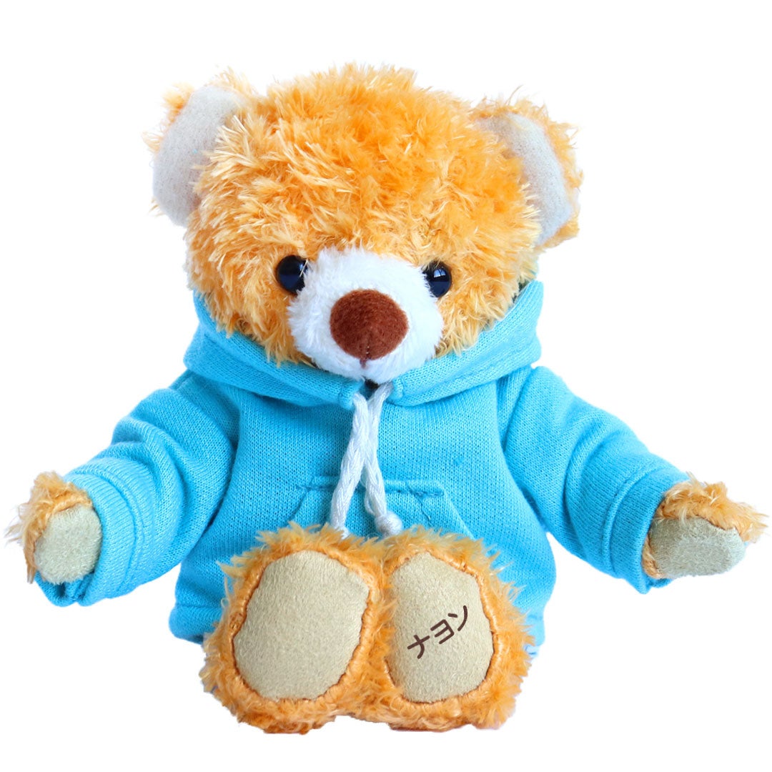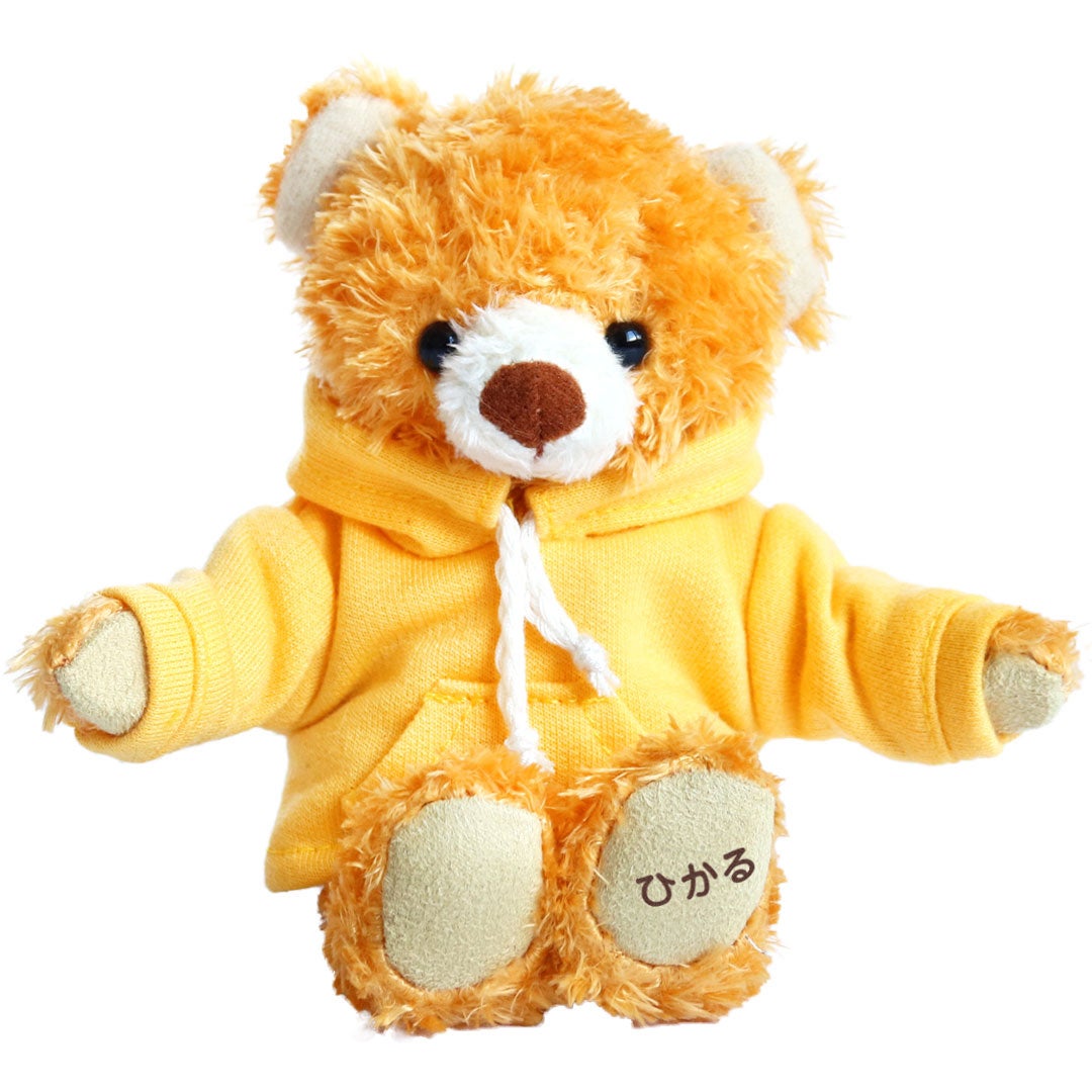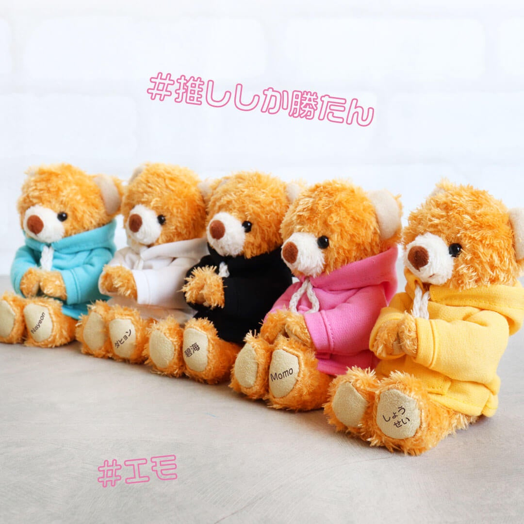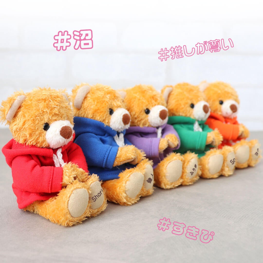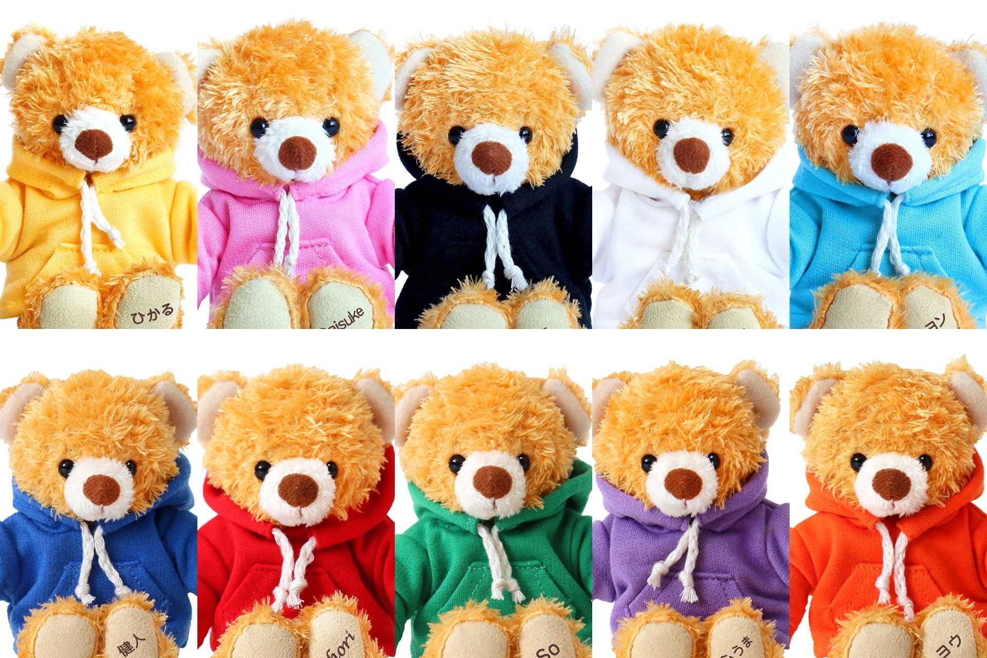 「推しカラーベア」とは、お好きなカラーのパーカーを着せたテディベアで、足裏にはご希望のお名前をプリントオーダーできる、自分だけの特別なテディベアです。