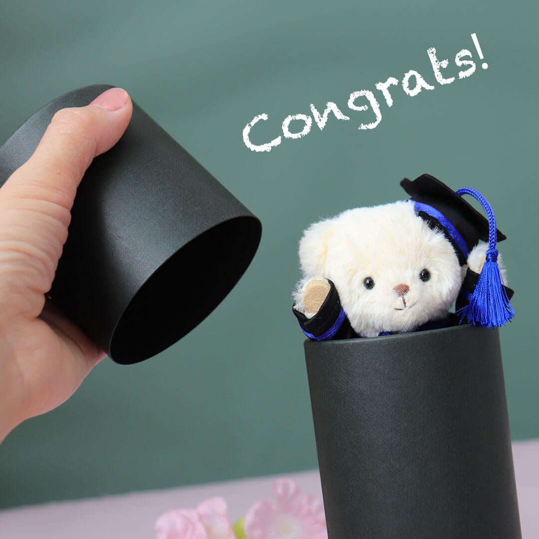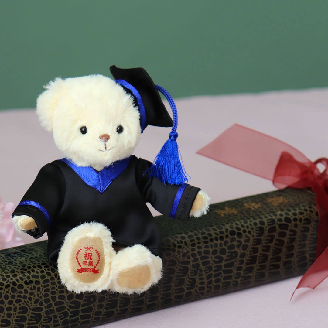 「2024卒業卒園記念ベア」は国際的な卒業のシンボルであるアカデミックガウンを身にまとい、卒園&卒業の特別な瞬間を演出する身長12cmミニテディベア。