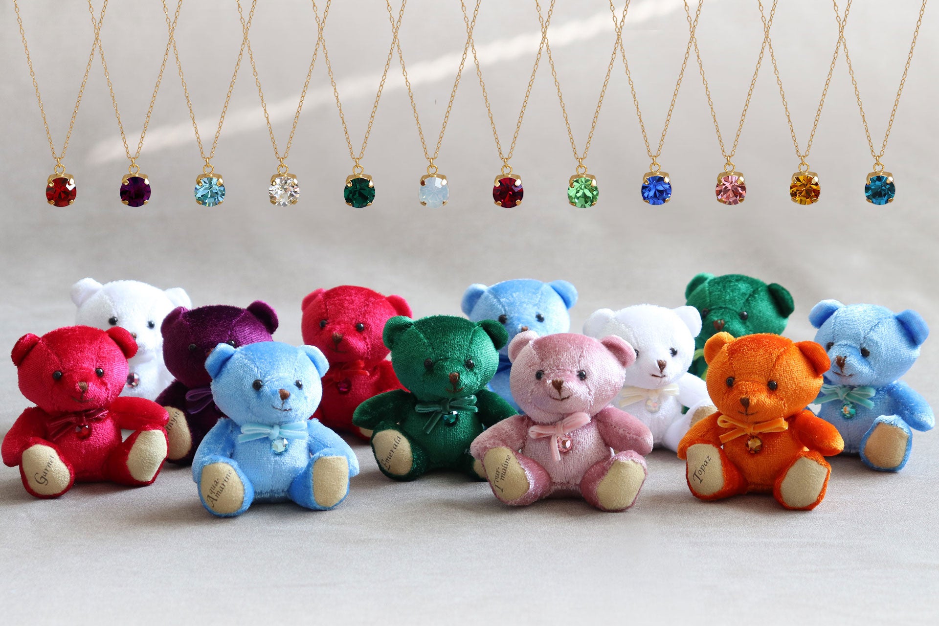 「宝石ベア」はガーネット、アメジスト、アクアマリン、ダイヤモンド、エメラルド、ムーンストーン、ルビー、ペリドット、サファイア、トルマリン、トパーズ、ターコイズの12色の宝石をイメージしたテディベアです。