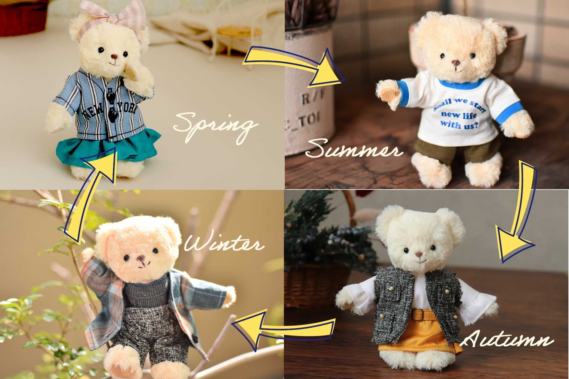 季節に合わせたコスチュームに着せ替えるだけで、あっという間にテディベアが変身。