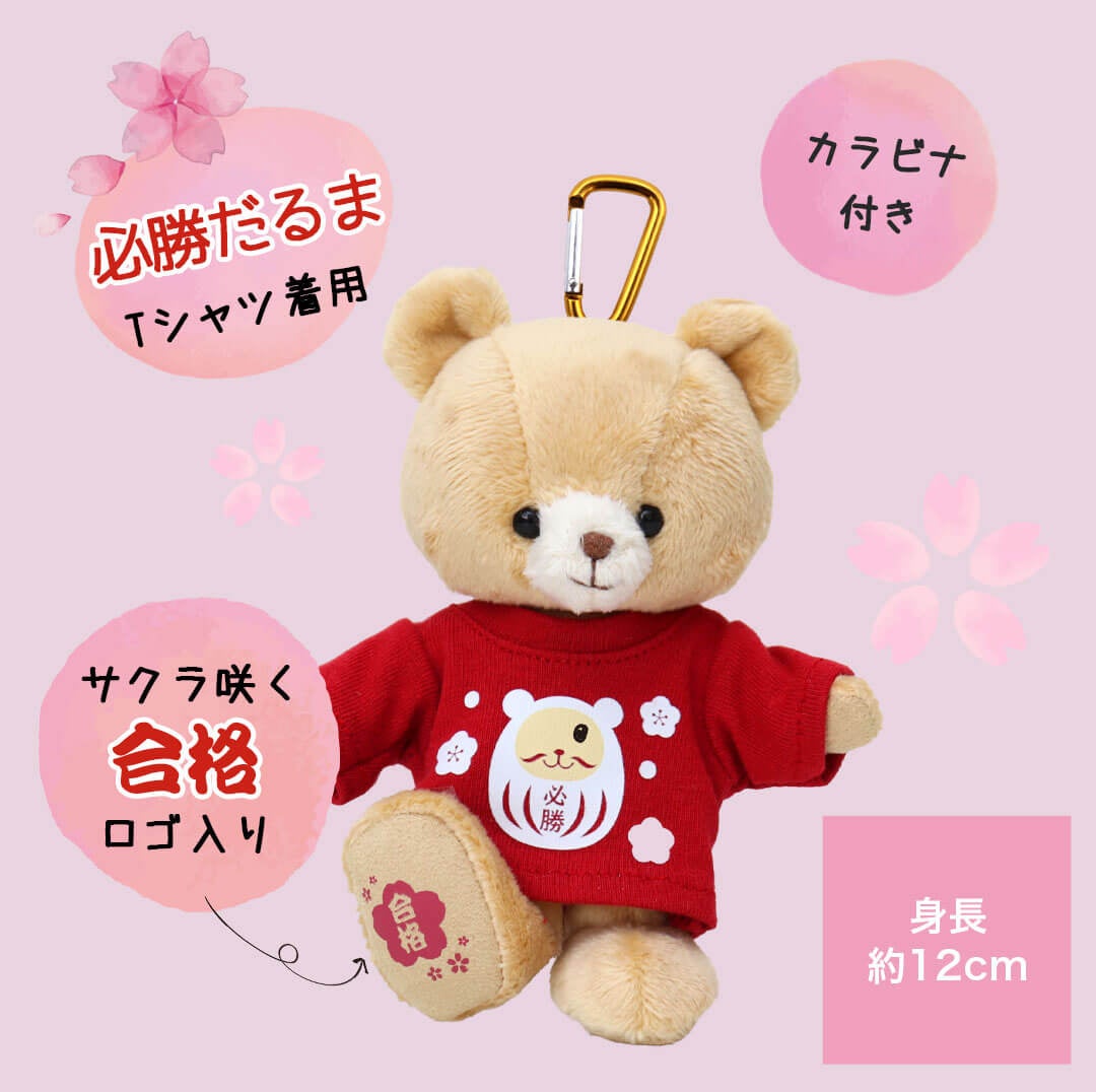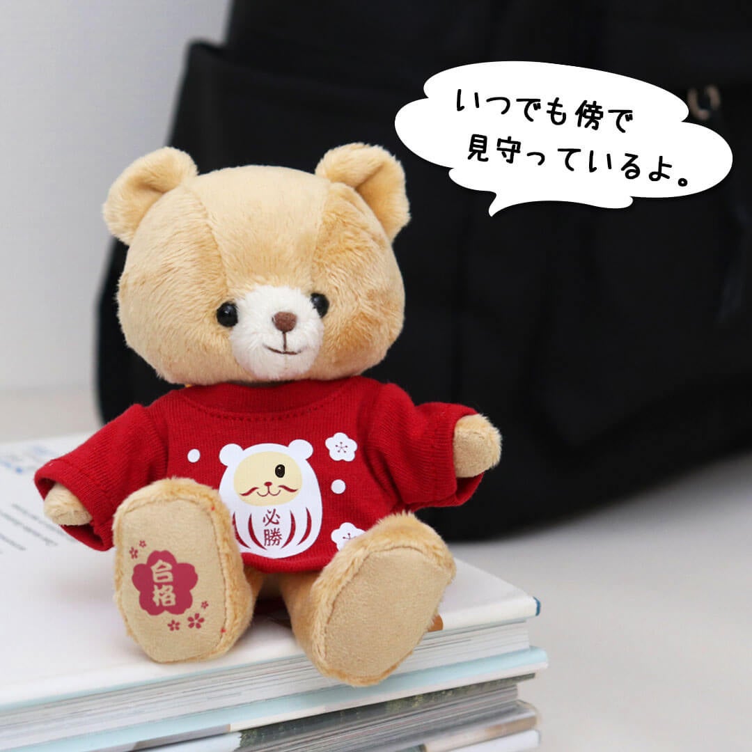 「だるま合格祈願ベア」は、クマ耳のついた縁起物のだるまのイラストがプリントされている「だるまTシャツ」を着た合格祈願のテディベア。