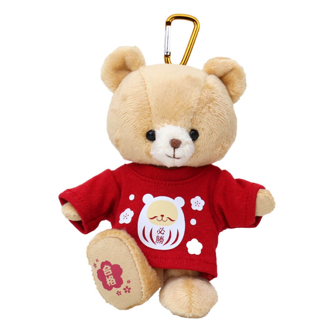 足裏に「合格」のロゴが入った特別なテディベア。かわいいだるまTシャツを着たミニテディベアは見ているだけでほっこりします。カラビナが付いているので、勉強机に飾ったり、鞄につけて持ち歩くことができます。しっかりとまり、「落ちない」ので安心して使えます。