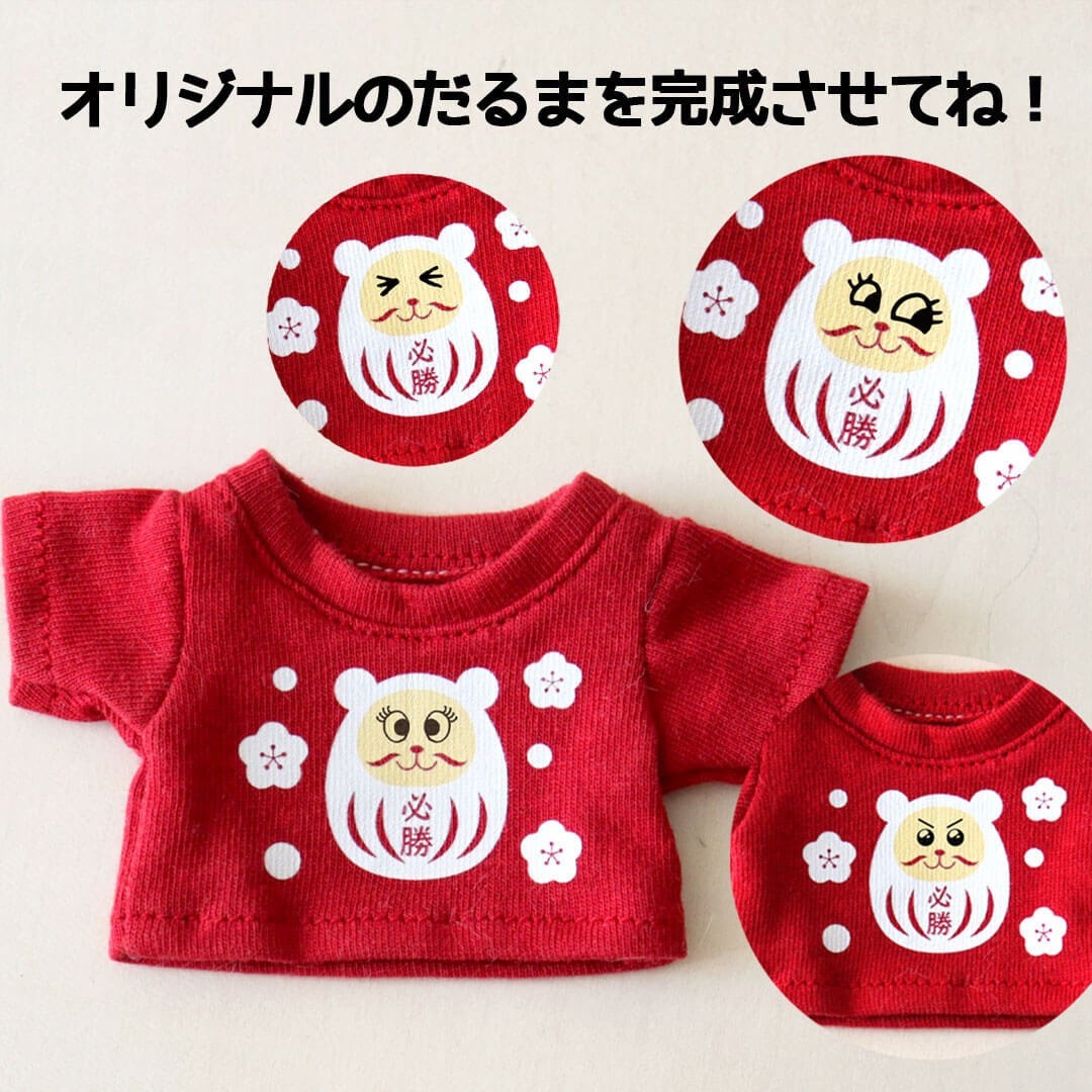 「だるま合格祈願ベア」は、クマ耳のついた縁起物のだるまのイラストがプリントされている「だるまTシャツ」を着た合格祈願のテディベア。