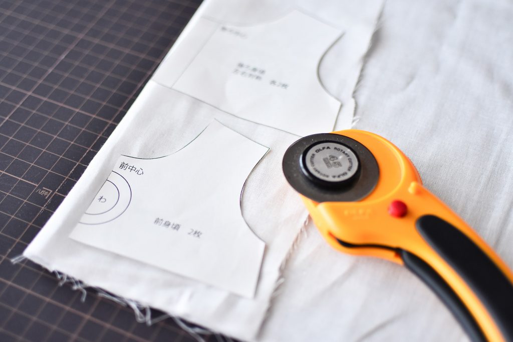 まち針や重石を乗せて、ずれないように裁断してくださいね!